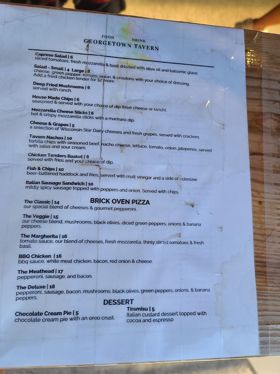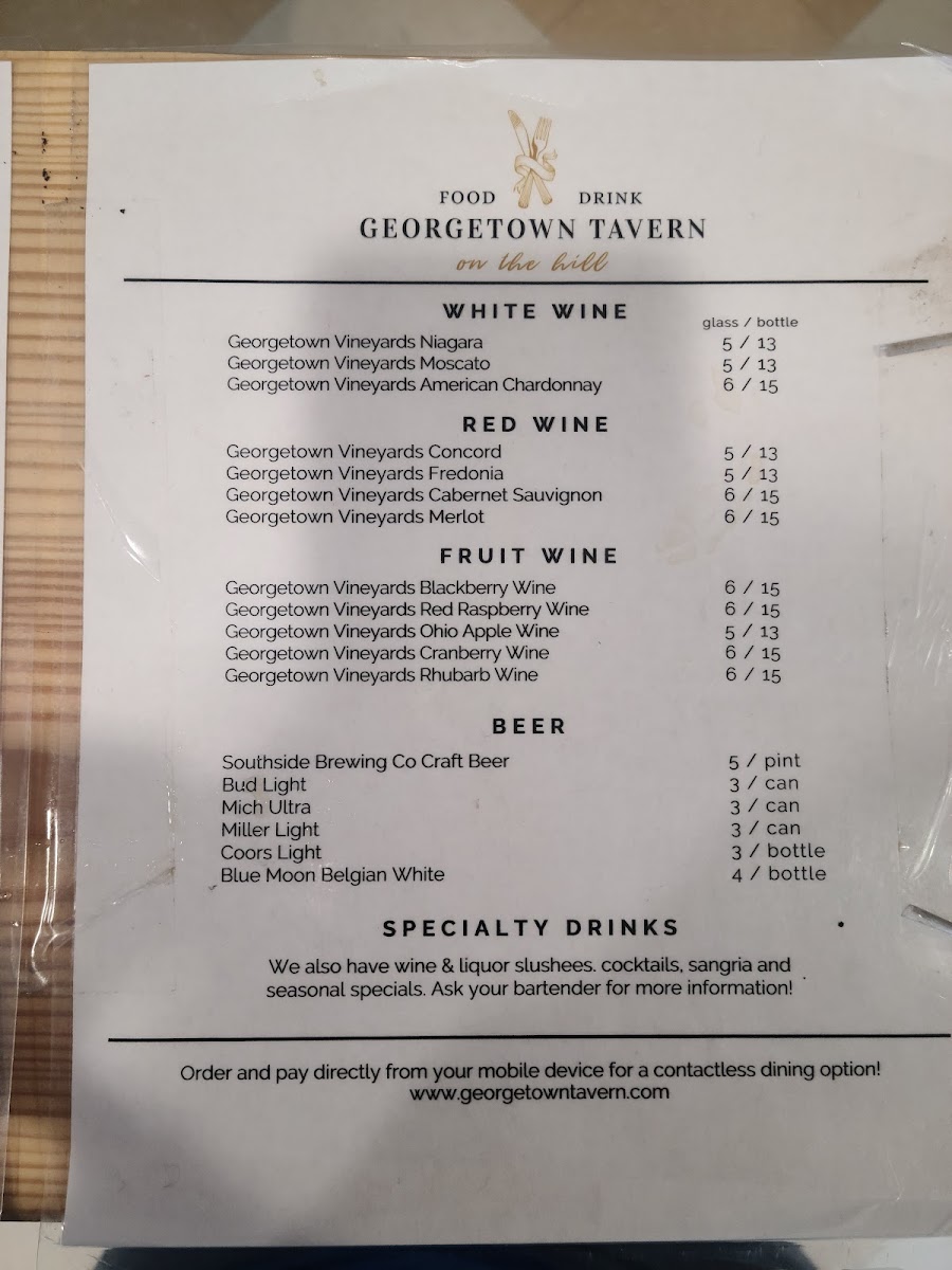 Welcome to Georgetown Tavern on the Hill, a hidden gem nestled in Cambridge, Ohio. This vibrant tavern serves up a delightful menu that focuses on wood-fired pizzas and an extensive wine selection, perfect for those seeking a casual yet enjoyable dining experience. Customers rave about the Florentine pizza, praised for its delicious flavors and perfect crispness. Pair your meal with a glass of the renowned 2018 Riesling or a craft beer from their impressive collection.